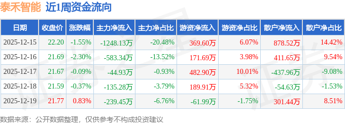 资金流向数据方面,本周泰禾智能主力资金算计净流出2251.13万元,游资资金算计净流入1152.11万元,散户资金算计净流入1099.02万元。本周资金流向一览见下表: