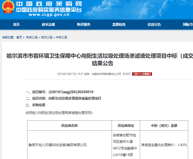 近日,中国固废网获悉,哈尔滨市向阳生活垃圾处理场渗滤液全量化处理服务项目中标结果公告发布,公告显示,鲁信天地人环境科技(安徽)集团有限公司中标该项目,中标价格为渗滤液全量化处理单价1.43%,项目预算金额为46,670,000.00元。